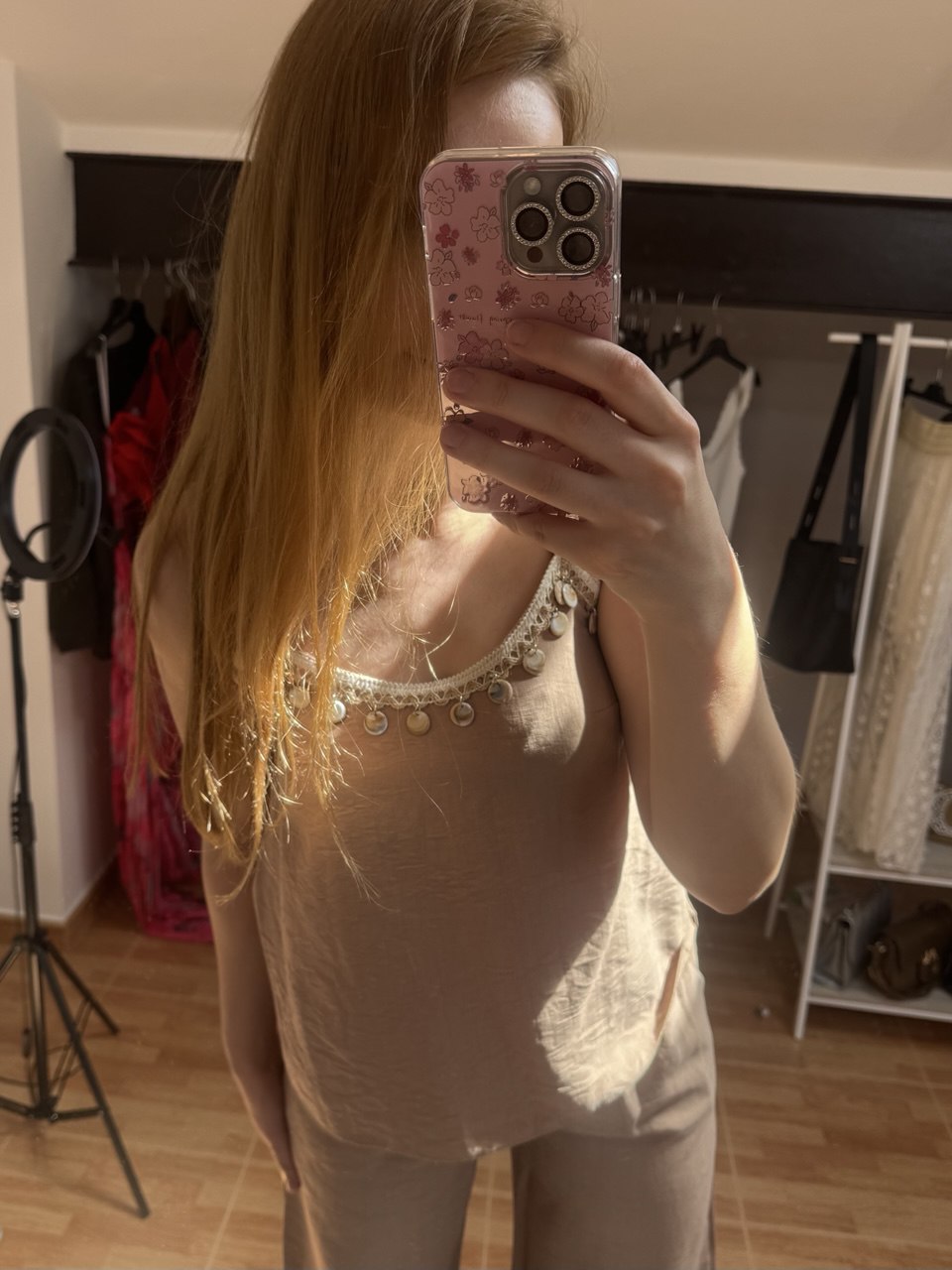 Conjunto de dos piezas en tono arena compuesto por top suelto con detalle de conchas y pantalón fluido con cintura elástica. Fresco, ligero y con caída bonita, ideal para verano. Talla única, se adapta cómodamente de la 36 a la 42. Perfecto para looks relajados pero con estilo.