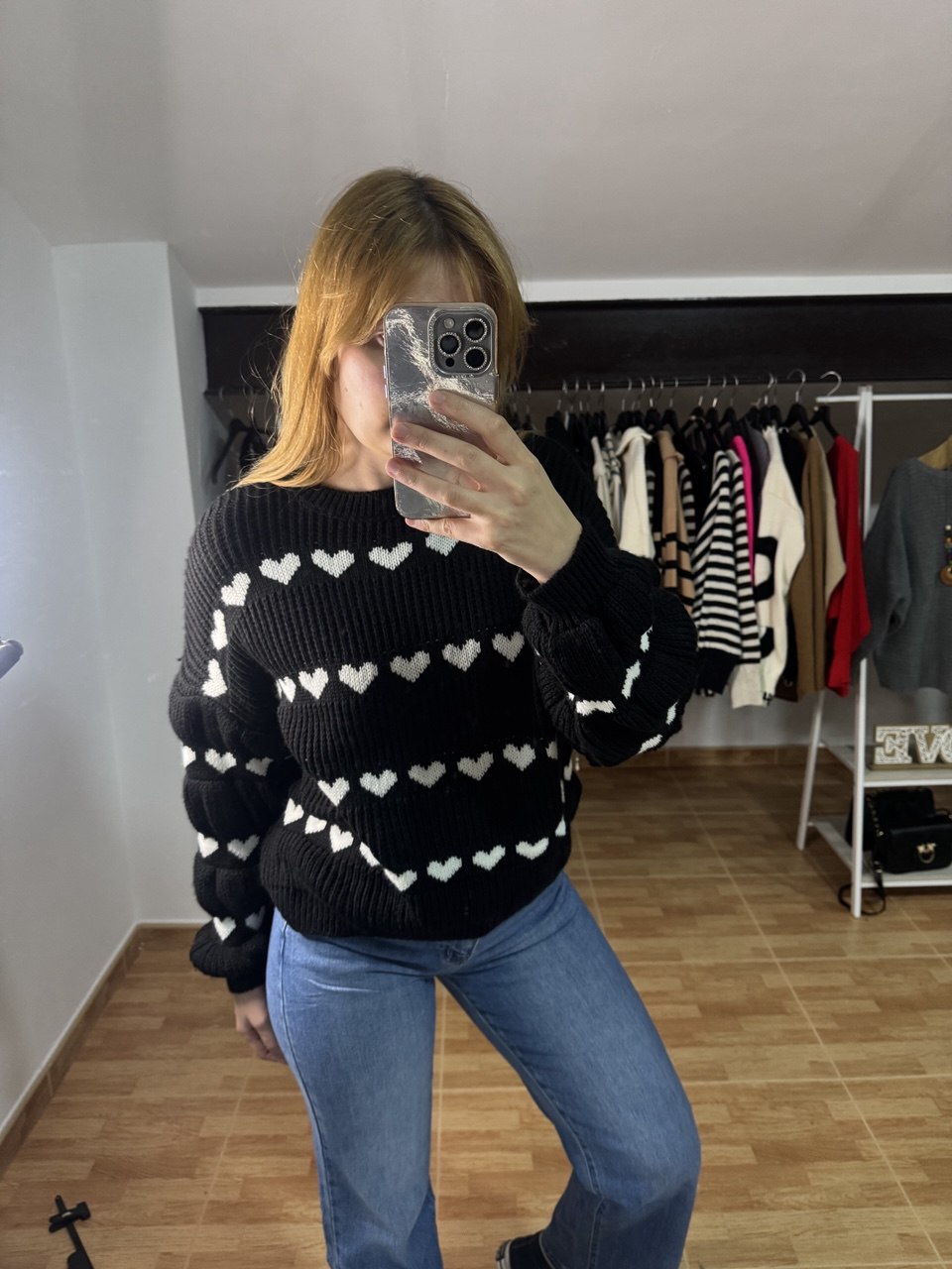 Jersey de punto grueso negro con diseño de corazones blancos, perfecto para crear un look romántico y moderno este invierno. Su corte cómodo y sus mangas abullonadas le dan un toque elegante y actual.