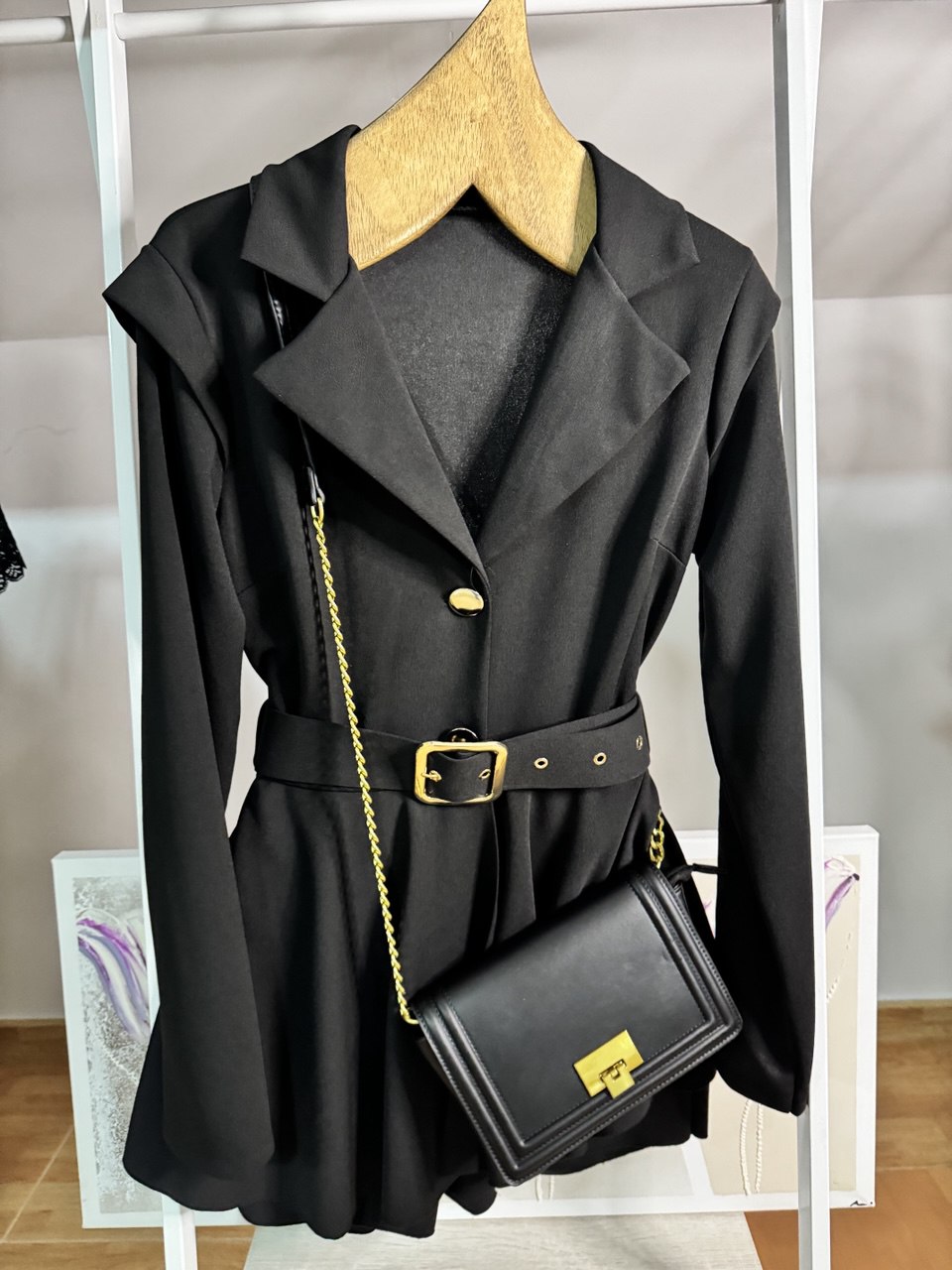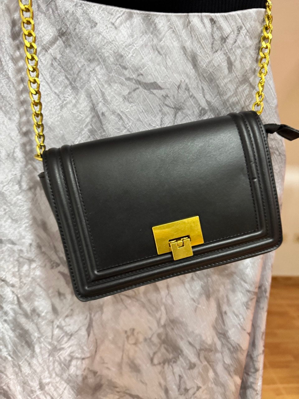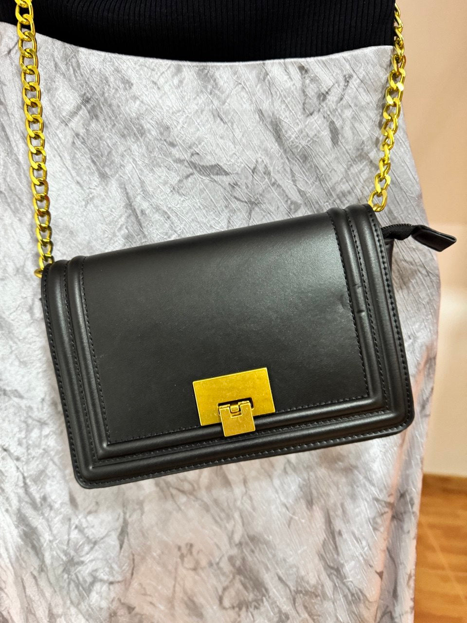 Este bolso de diseño sofisticado combina el minimalismo con un toque de lujo. Confeccionado en cuero negro de acabado liso, su estructura compacta y sus detalles refinados lo hacen perfecto para cualquier ocasión. La cadena dorada añade un aire de elegancia, mientras que el cierre metálico geométrico en tono dorado aporta un toque moderno y exclusivo. Ideal para llevar lo esencial con estilo y distinción.