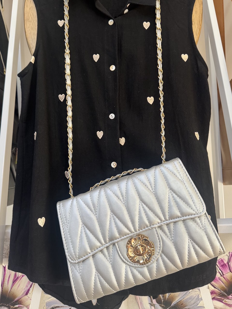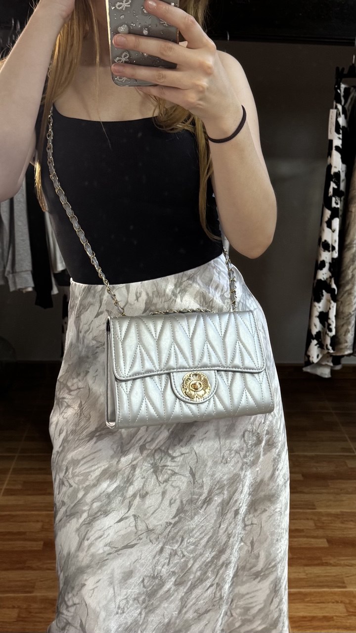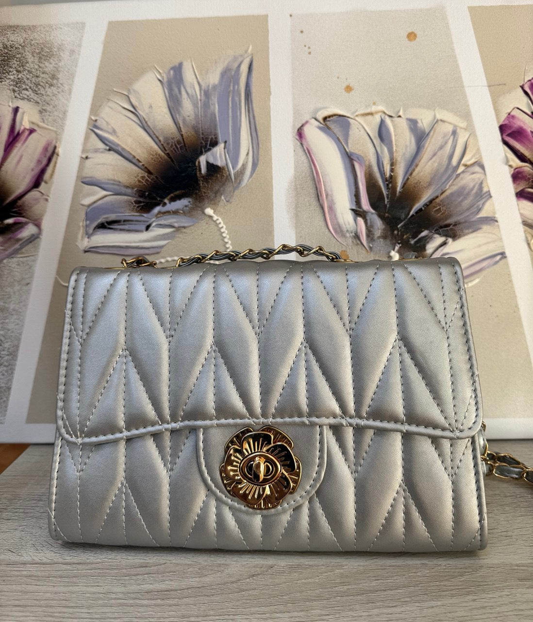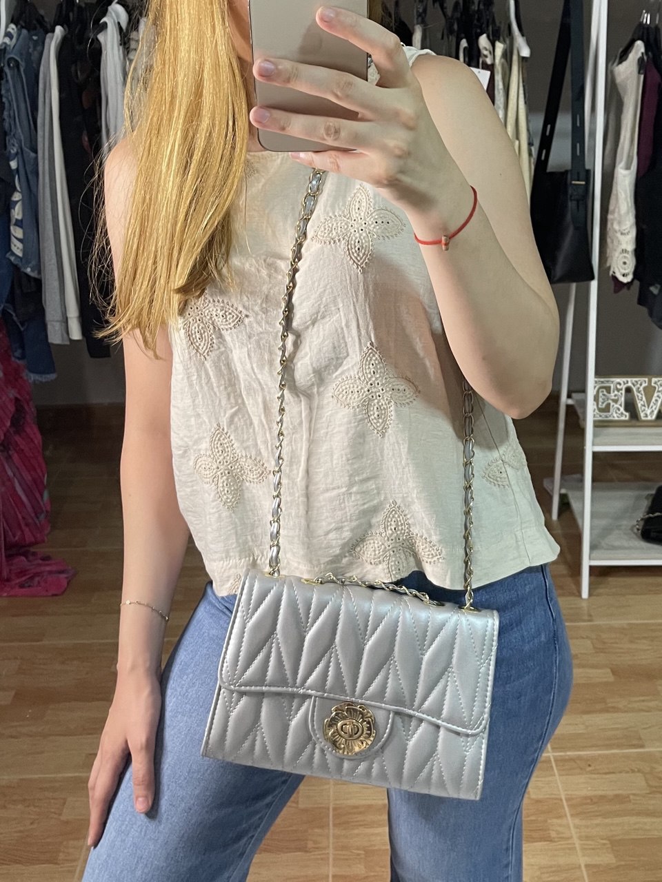 Añade un toque de dulzura y sofisticación a tus looks con nuestro Bolso Dolce, confeccionado en un delicado tono plateado con textura acolchada en patrón de rombos. Su diseño elegante combina una cadena entrelazada con cinta plateada y un cierre dorado en forma de flor que lo convierte en el accesorio perfecto tanto para el día como para la noche.