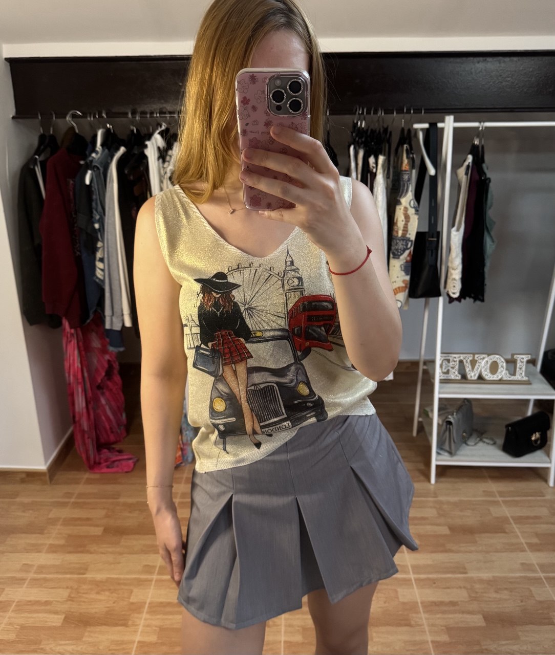 Falda de corte estructurado con diseño de tablas que aporta movimiento y sofisticación. Confeccionada en tela sastre de tono gris, es perfecta para looks elegantes y versátiles. Su estilo clásico y atemporal la convierte en una prenda ideal para combinar con blusas, corsets o blazers, adaptándose tanto a outfits formales como a propuestas más modernas y atrevidas.