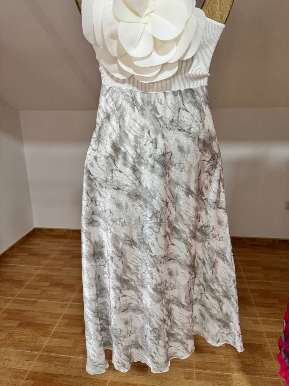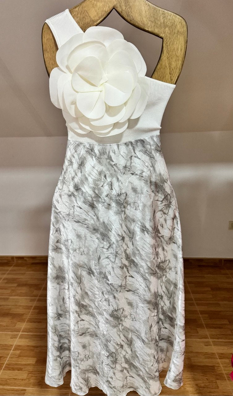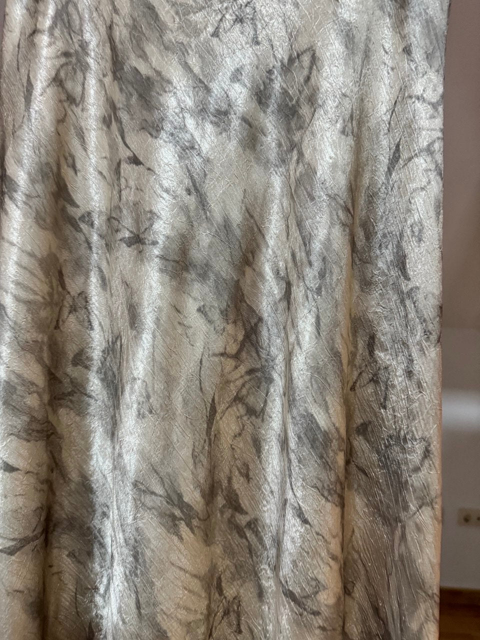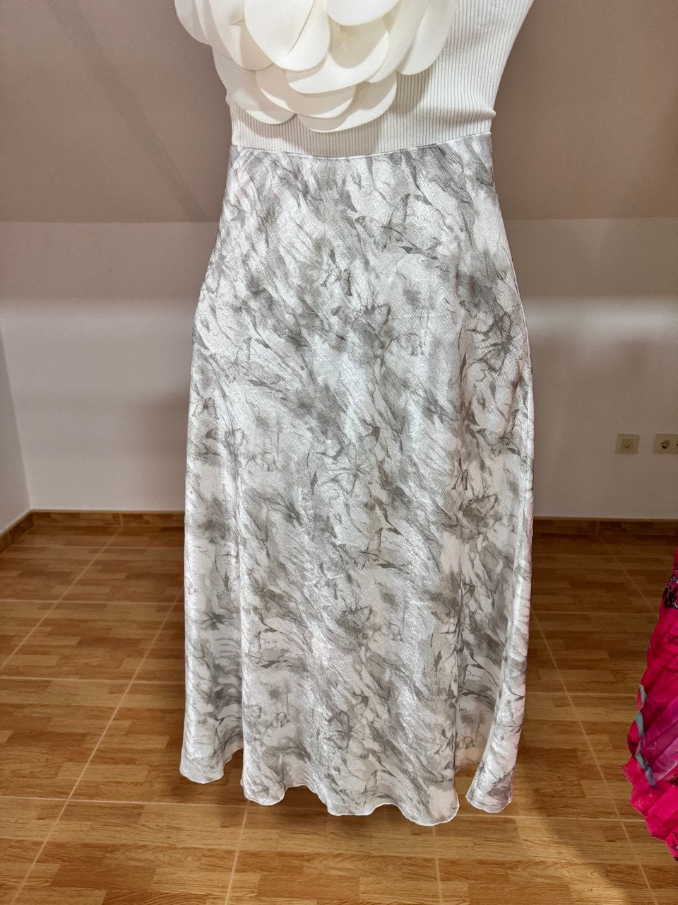 Falda larga con un elegante efecto mármol en tonos blanco y gris, confeccionada en tela satinada de acabado suave y ligero. Su diseño elástico se adapta a todas las tallas, brindando comodidad y un ajuste perfecto a la silueta. Su caída fluida aporta movimiento y sofisticación, ideal para ocasiones especiales o un look moderno y versátil. Combínala con blusas ajustadas o tops minimalistas para resaltar su diseño único.