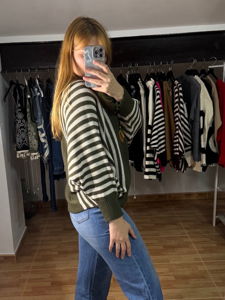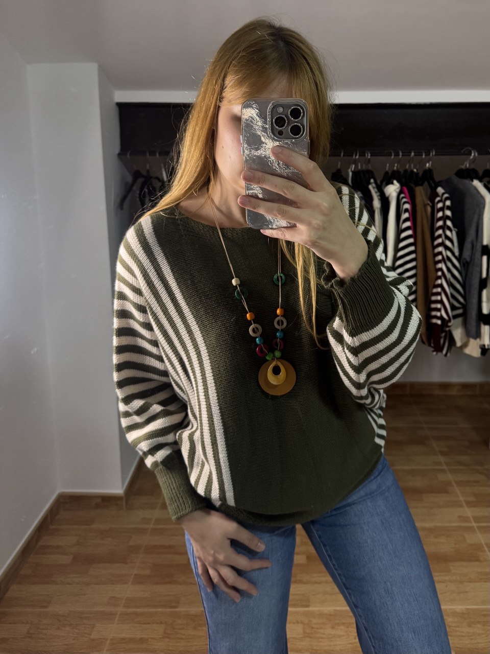 Este jersey de punto oversize combina comodidad y estilo con su diseño de rayas en verde oliva . Incluye un collar largo de madera que aporta un toque boho y original.