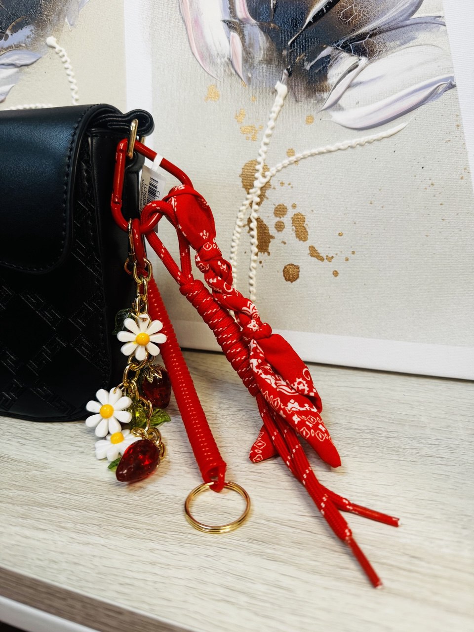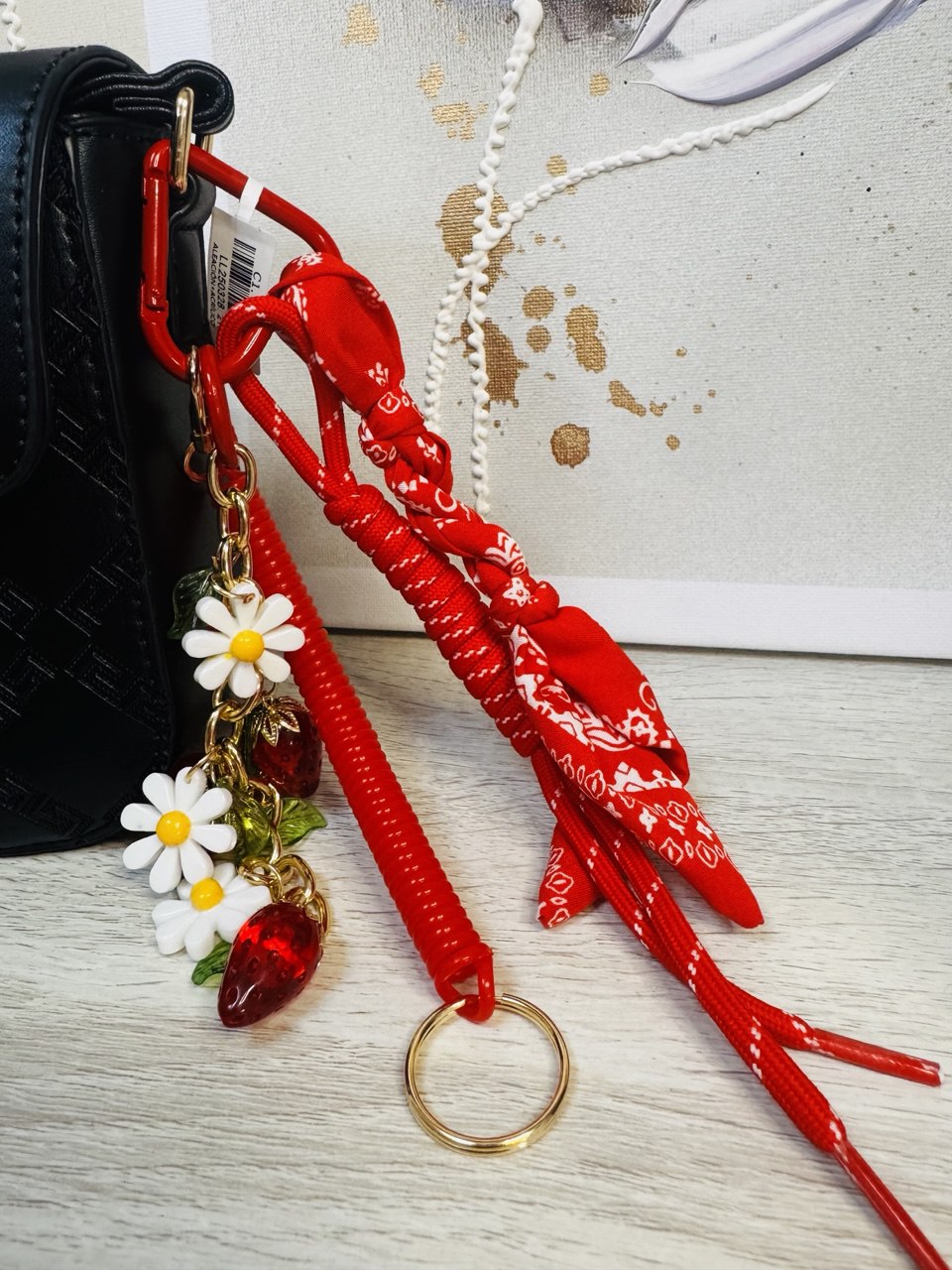Dale vida a tu bolso con este encantador llavero decorativo. Combina flores blancas, fresas en acrílico rojo y un pañuelo rojo estilo bandana, todo unido por detalles en dorado y una cuerda trenzada vibrante. Ideal para añadir un toque fresco, alegre y original a cualquier look.