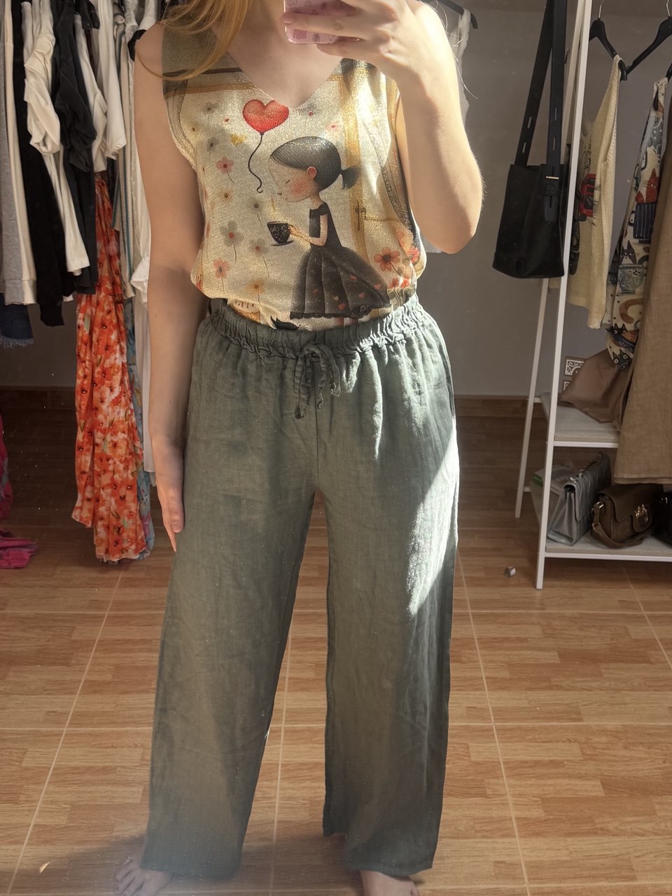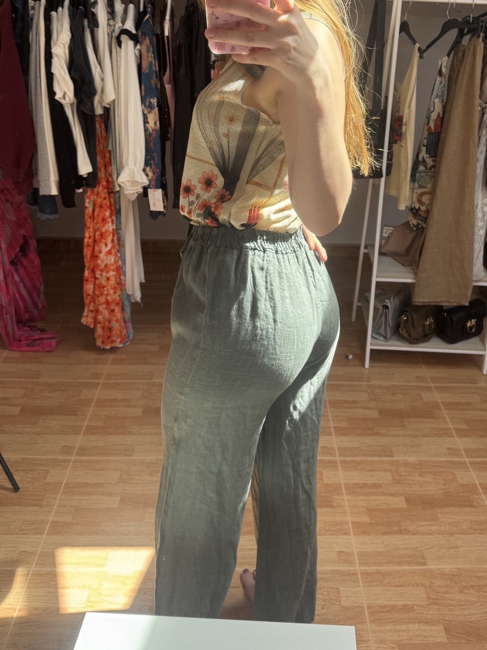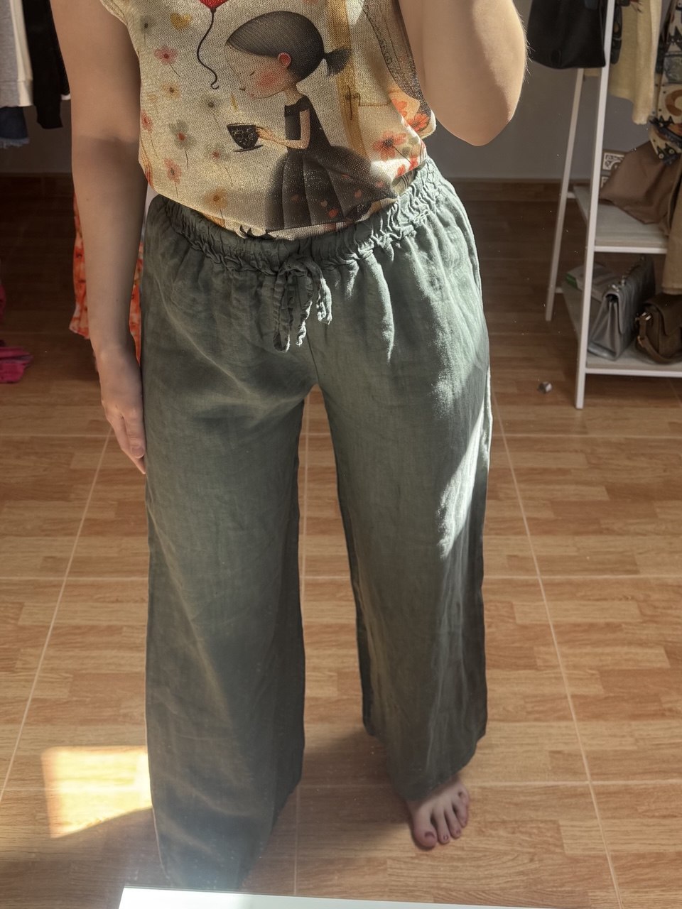 Este pantalón está hecho de lino 100% natural, ideal para el verano por su frescura y ligereza. De talla única, se adapta perfectamente desde la S hasta la L. Con pierna ancha y cintura elástica ajustable, es cómodo, versátil y fácil de combinar.