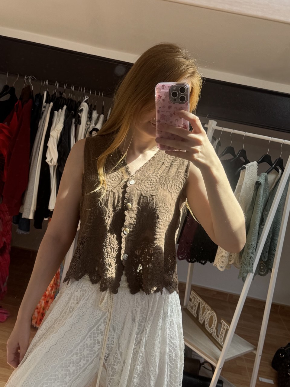 Confeccionado en 100% algodón, este top combina la frescura del tejido con la delicadeza del bordado floral y un precioso encaje en el bajo. Su diseño con botones frontales, escote en pico y acabado bohemio lo convierte en una pieza versátil y ligera, perfecta para los días de sol.