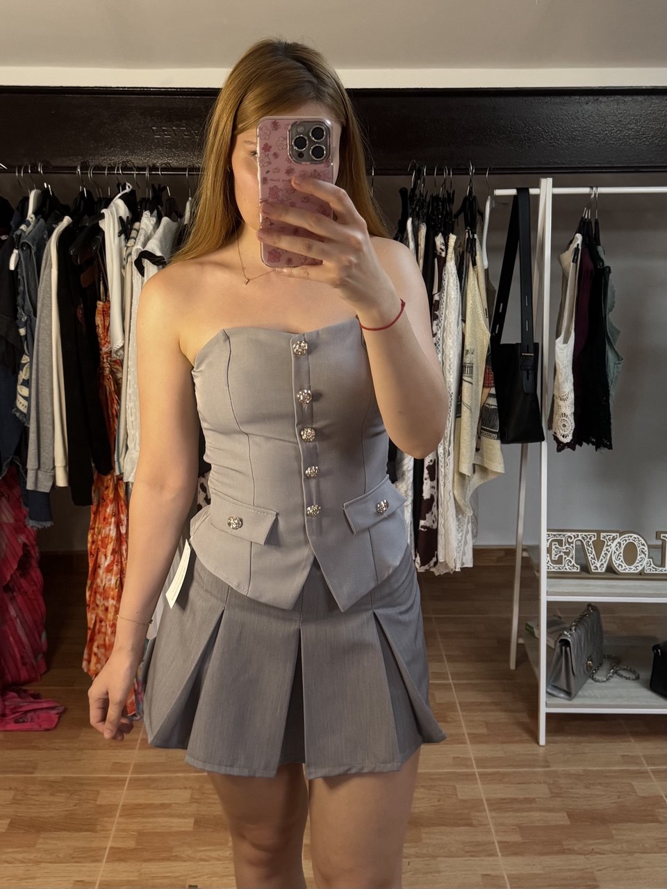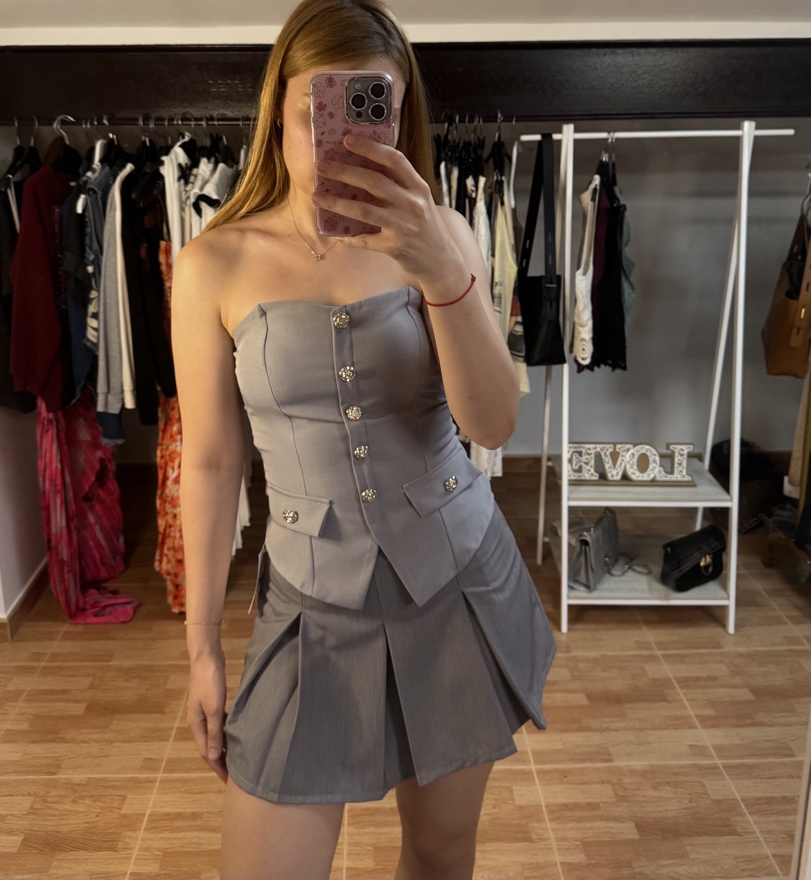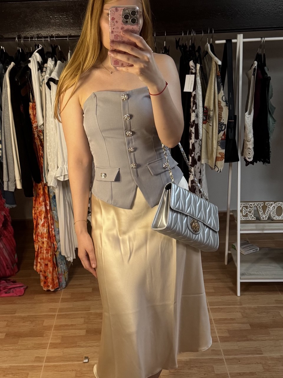 Top tipo corset en tono gris con un diseño estructurado que realza la figura, inspirado en el estilo sastre. Destaca por sus botones dorados en el frente, bolsillos decorativos y un corte sofisticado que combina feminidad y elegancia. Su ajuste ceñido y su silueta moderna lo hacen ideal para looks formales o conjuntos chic con falda o pantalón. Perfecto para eventos especiales o un outfit audaz y estilizado.