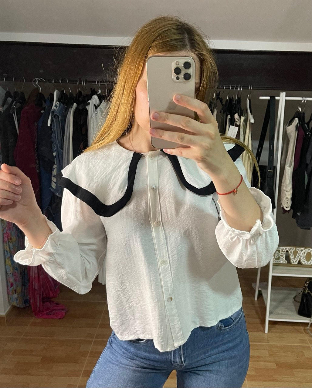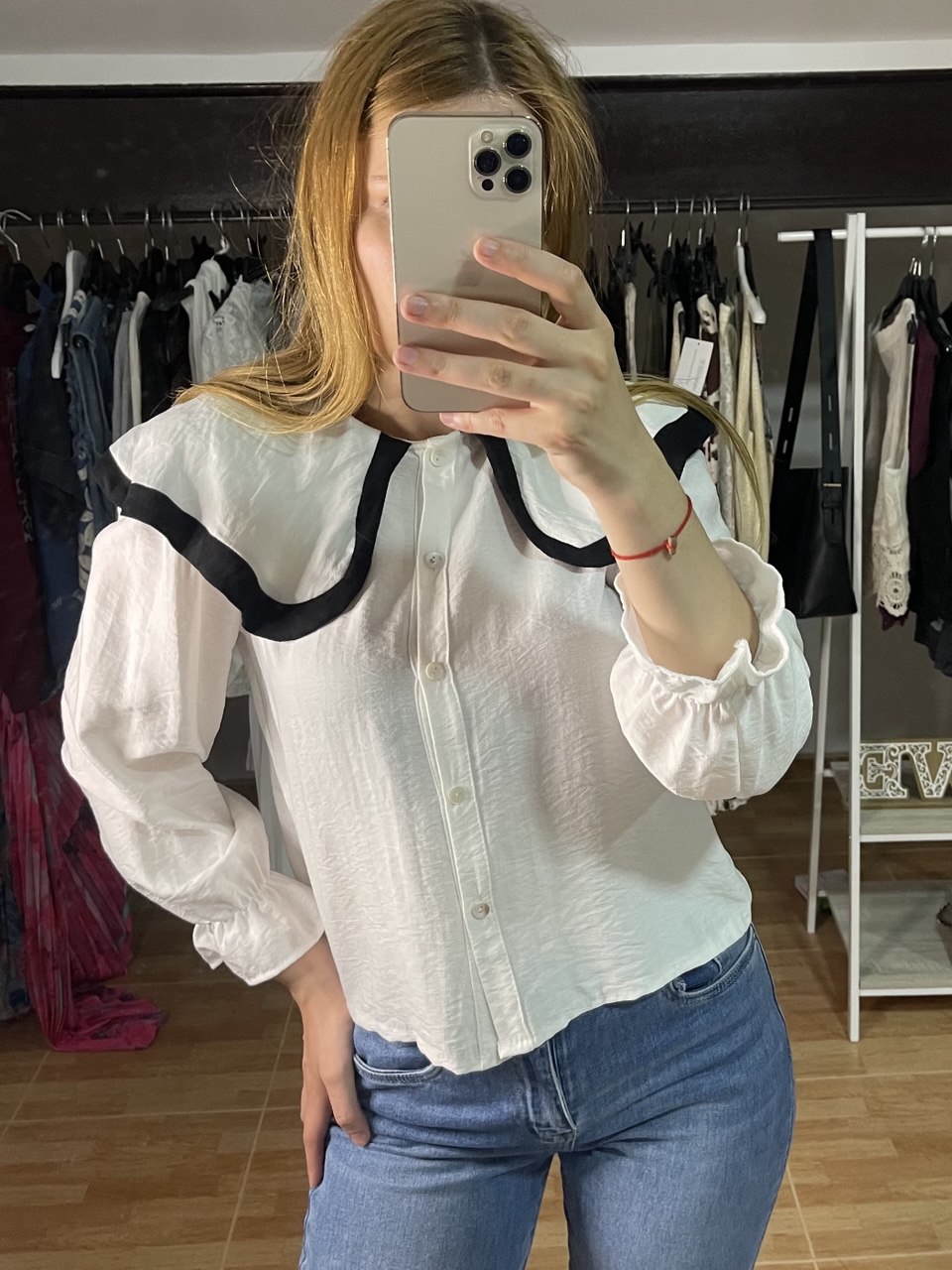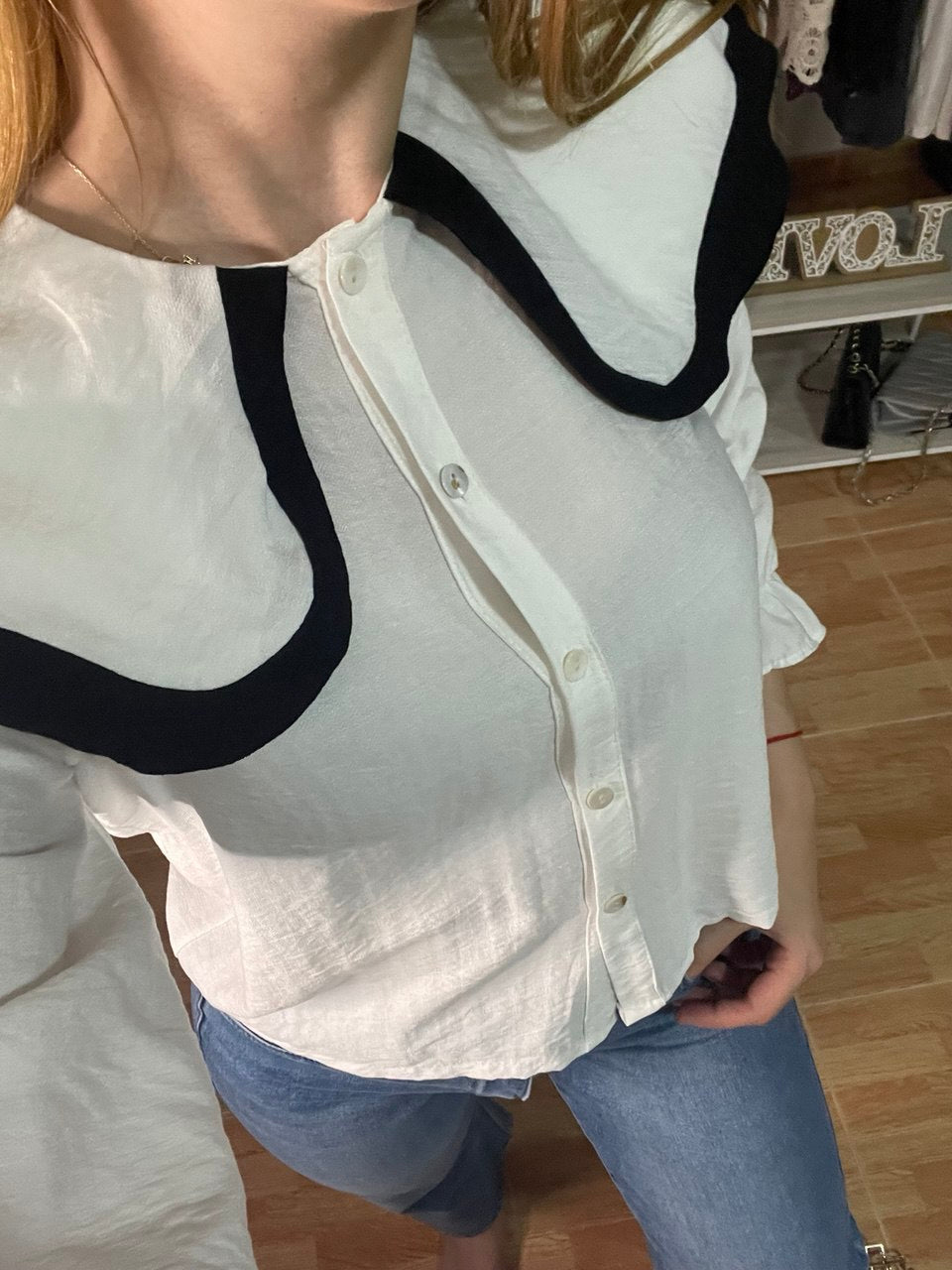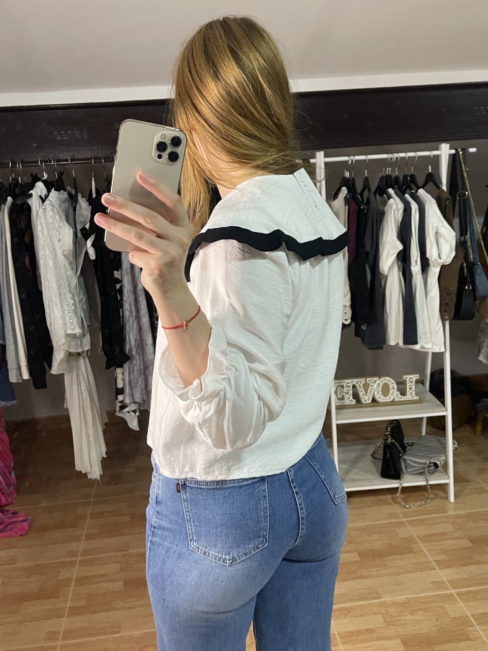 Esta blusa blanca es la definición de sofisticación con un toque vintage. Su cuello bobo XL con ribete negro añade un detalle único y chic, perfecto para elevar cualquier look.