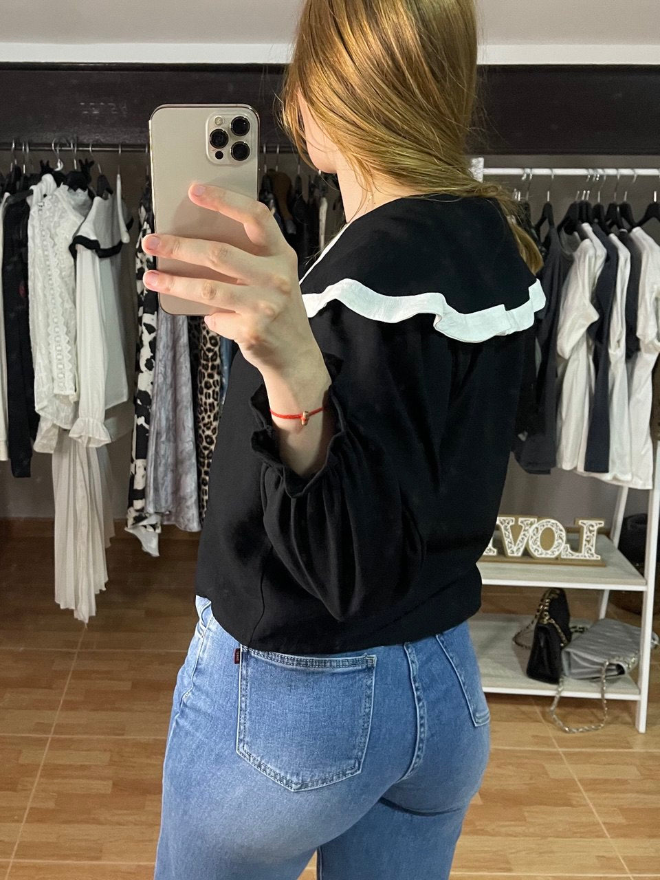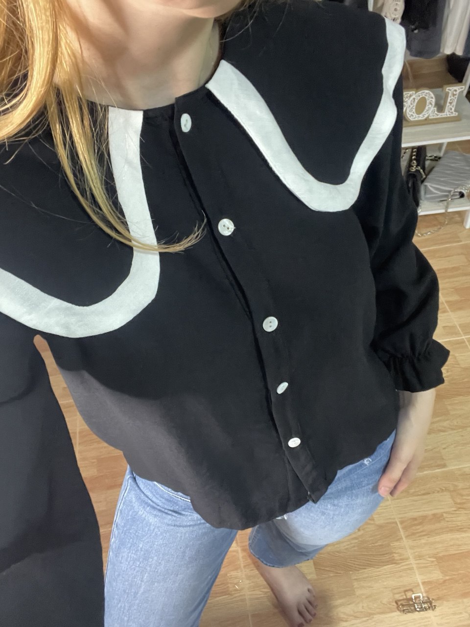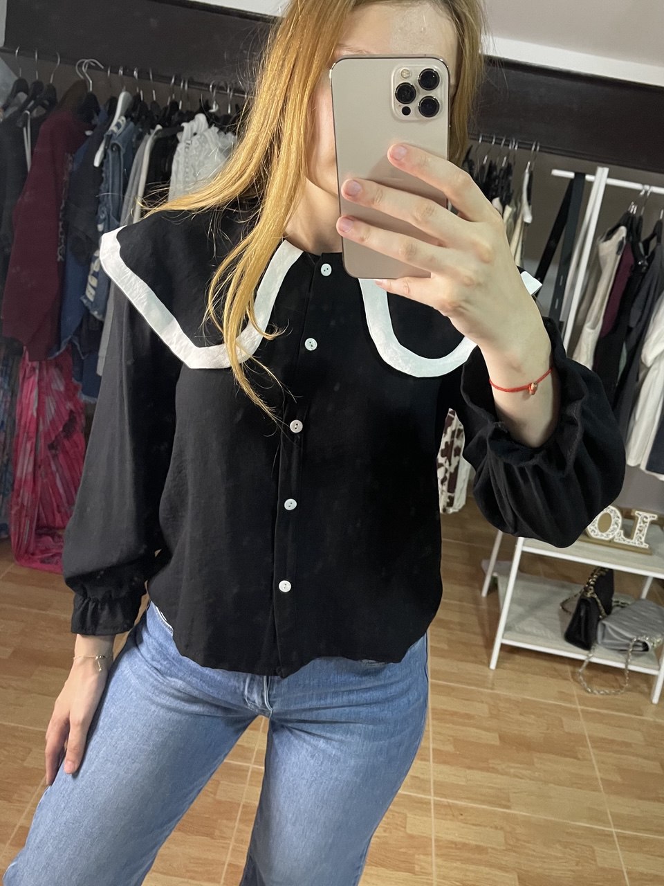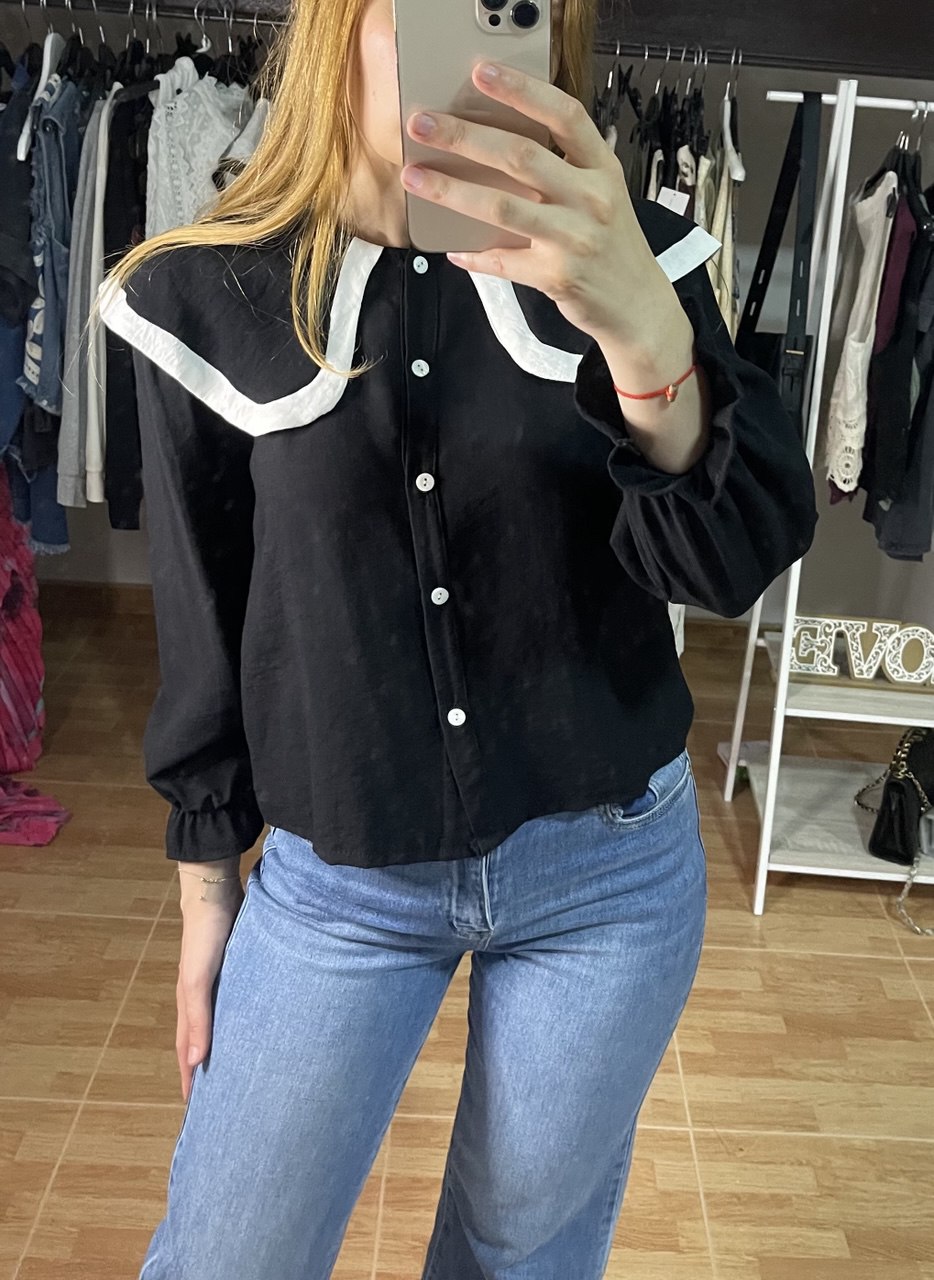 Esta blusa negra es la definición de sofisticación con un toque vintage. Su cuello bobo XL con ribete negro añade un detalle único y chic, perfecto para elevar cualquier look.
