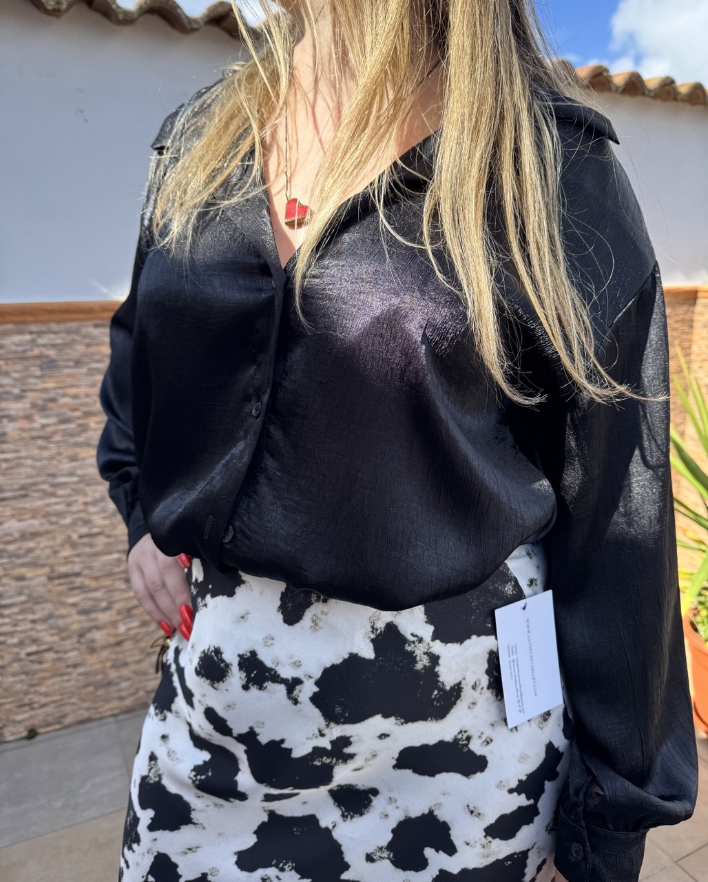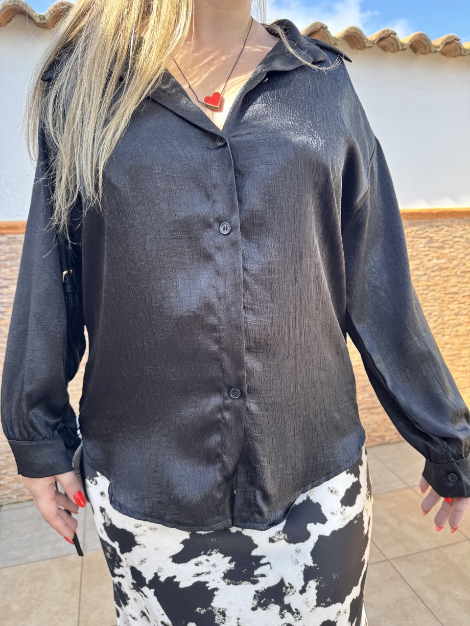 Es el básico elegante que eleva cualquier look. Con su tejido satinado de acabado sutilmente texturizado y su corte relajado, combina comodidad y estilo en una sola prenda. Su diseño clásico de botones frontales y cuello camisero la hace perfecta para llevar tanto en ocasiones formales como en outfits más casuales.