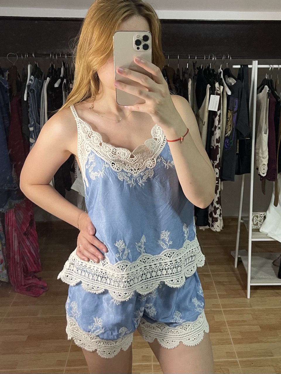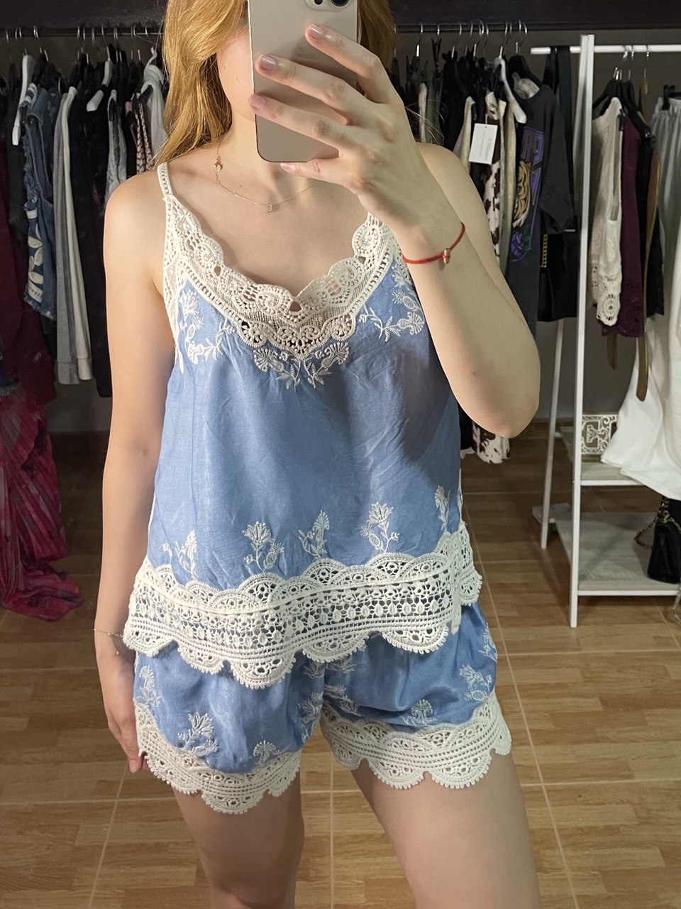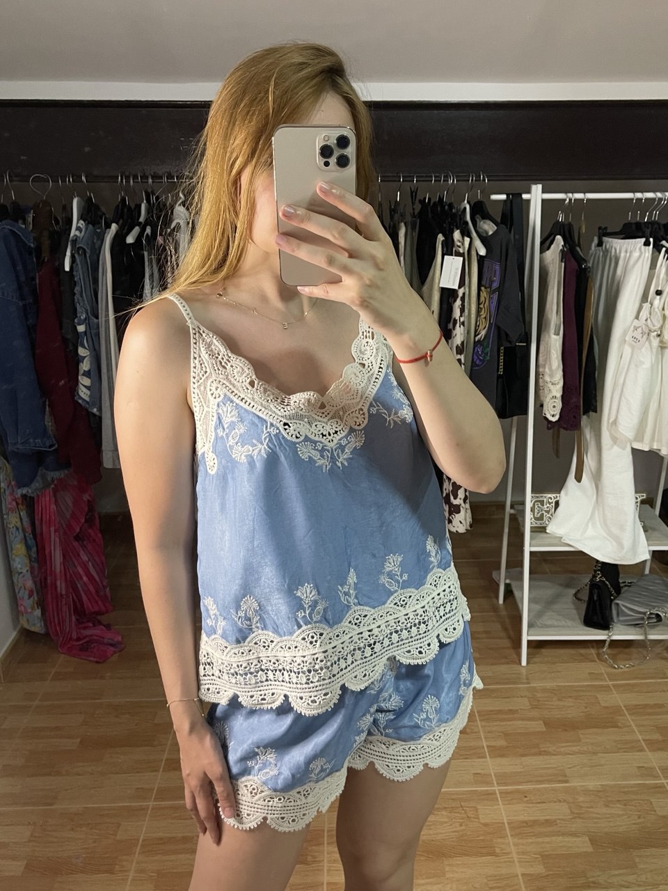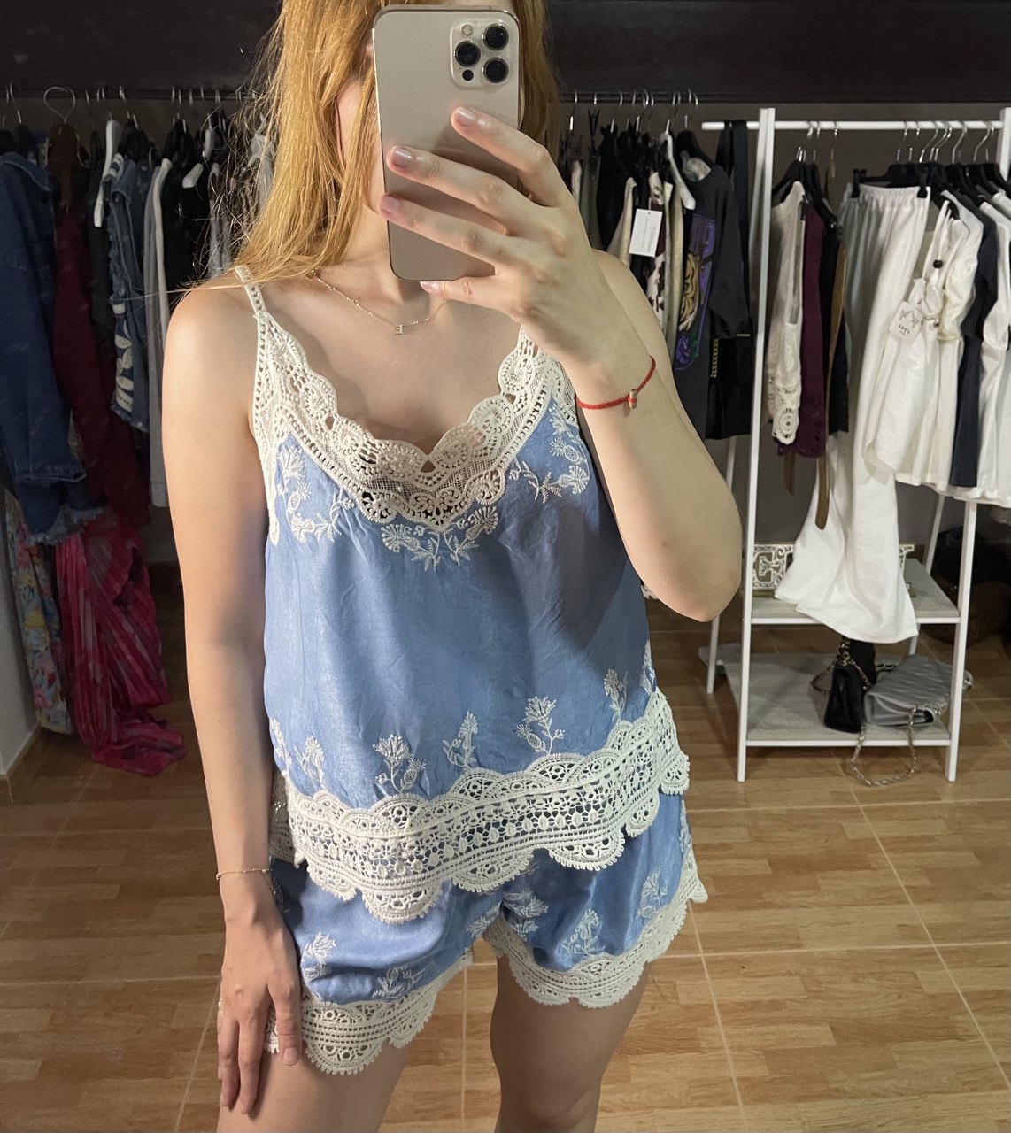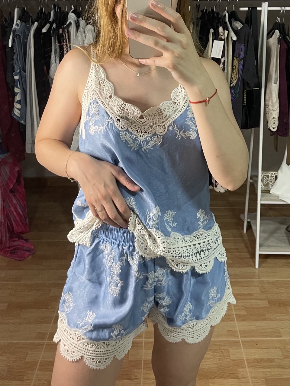 Descubre el conjunto Blue Boho, una combinación perfecta de frescura, estilo y romanticismo. Formado por un top de tirantes y short a juego, este conjunto azul empolvado destaca por sus bordados florales delicados y el encaje blanco de estilo vintage en el escote, bajo y dobladillos.