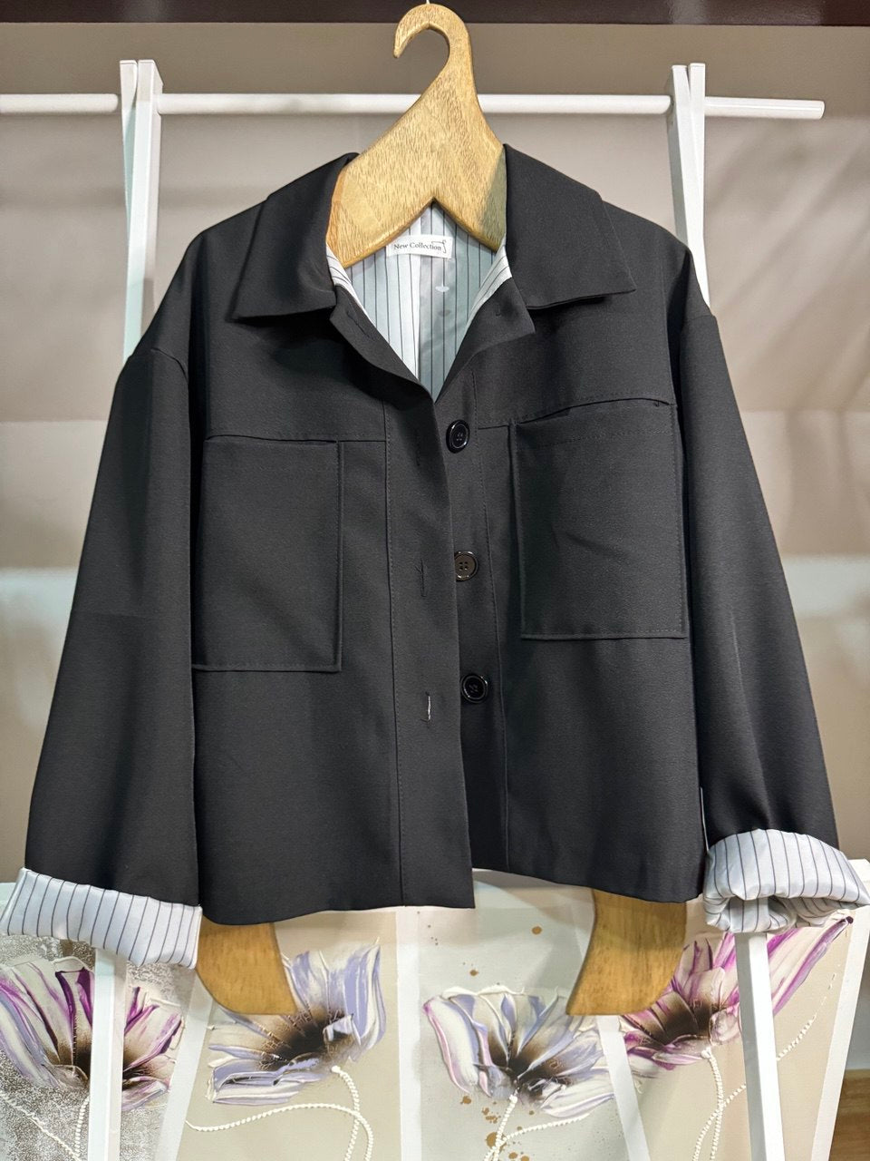 La chaqueta incluye forro interior de rayas y mangas 3/4 para un toque moderno.