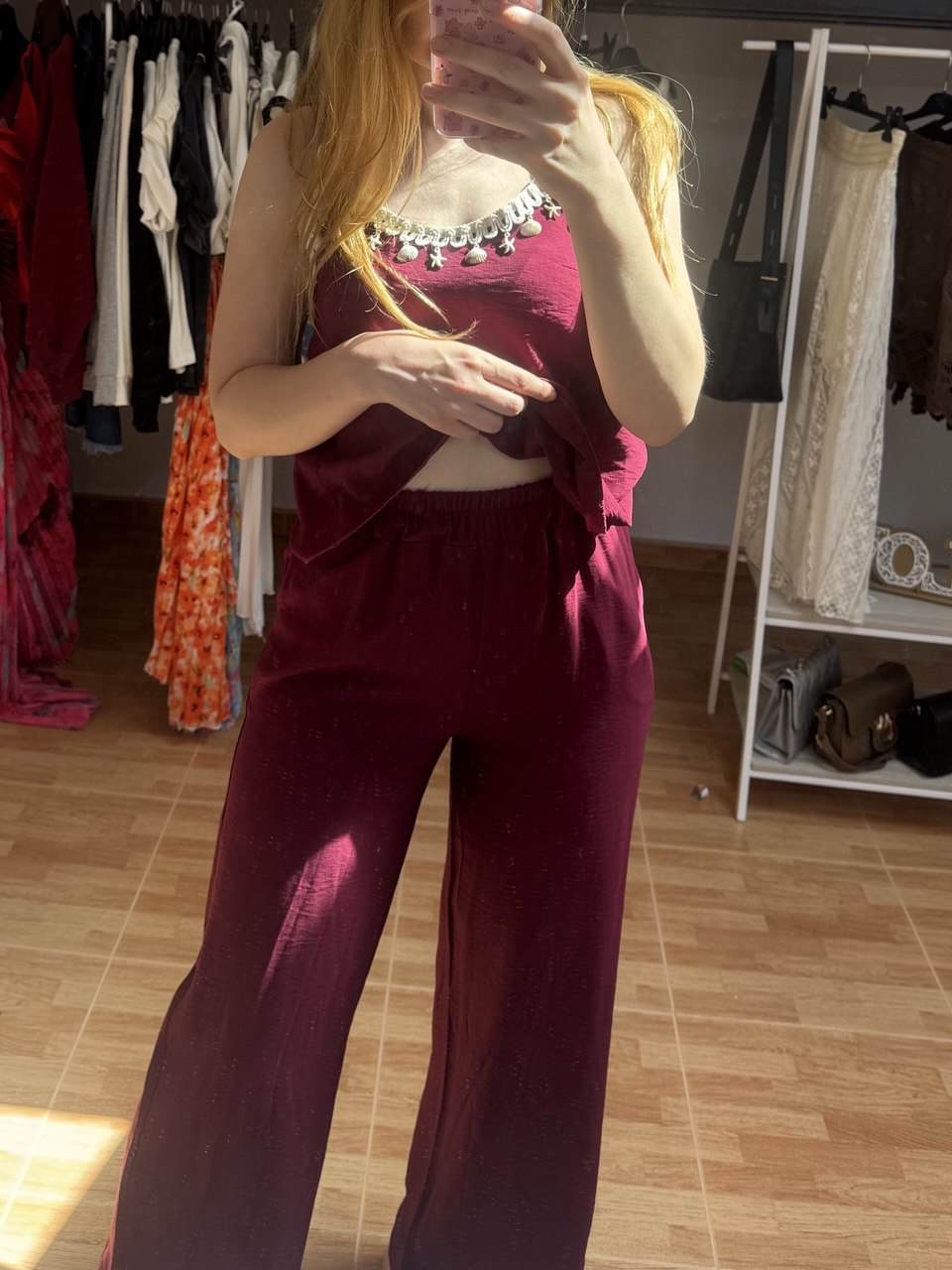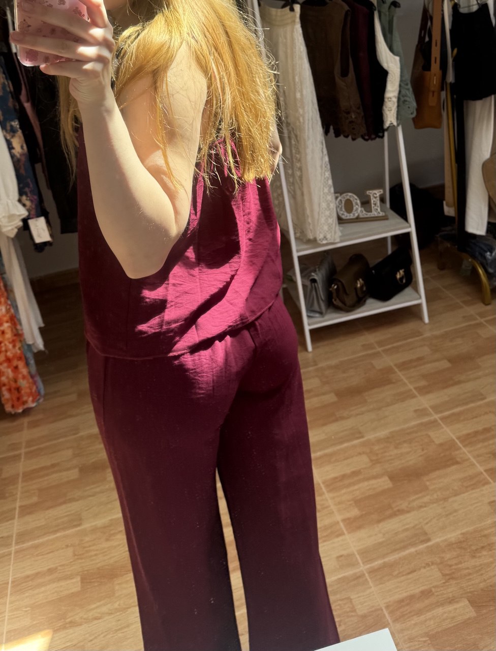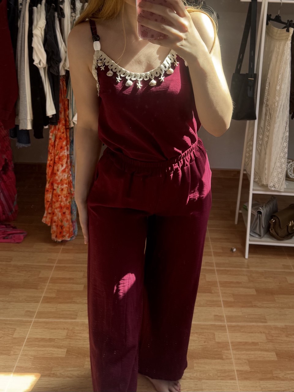 Conjunto de dos piezas en tono burgundy compuesto por top suelto con detalle de conchas y pantalón fluido con cintura elástica. Fresco, ligero y con caída bonita, ideal para verano. Talla única, se adapta cómodamente de la 36 a la 42. Perfecto para looks relajados pero con estilo.