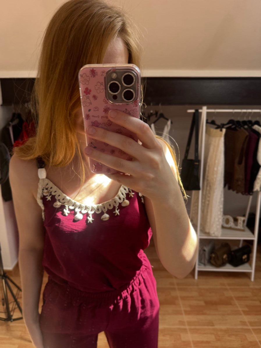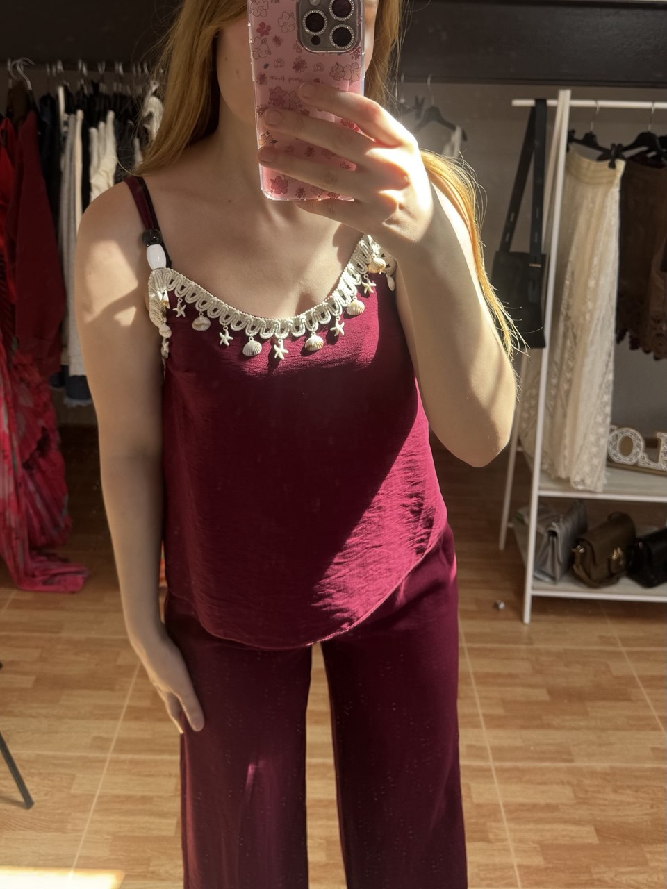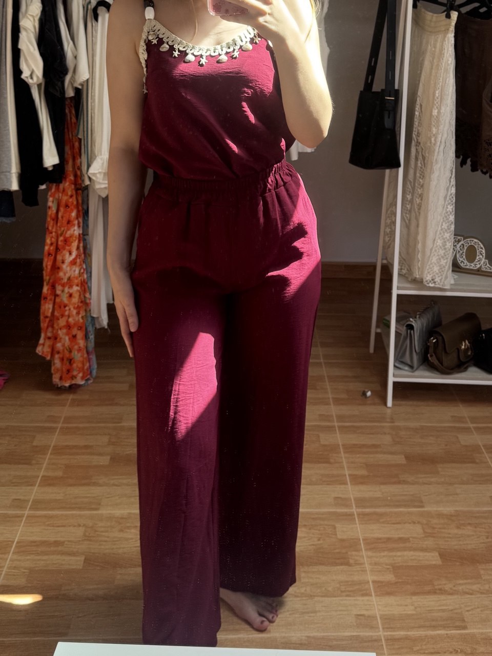 Conjunto de dos piezas en tono burgundy compuesto por top suelto con detalle de conchas y pantalón fluido con cintura elástica. Fresco, ligero y con caída bonita, ideal para verano. Talla única, se adapta cómodamente de la 36 a la 42. Perfecto para looks relajados pero con estilo.