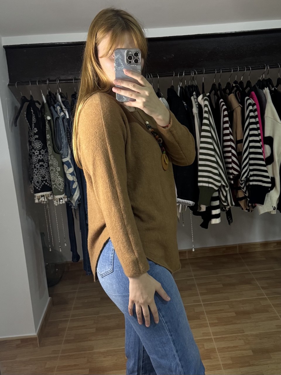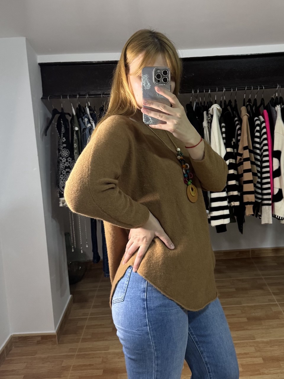Jersey de punto suave en color marrón, perfecto para los días fríos de otoño e invierno. Su diseño sencillo y elegante realza la figura con un corte redondeado en la parte inferior que estiliza la silueta.