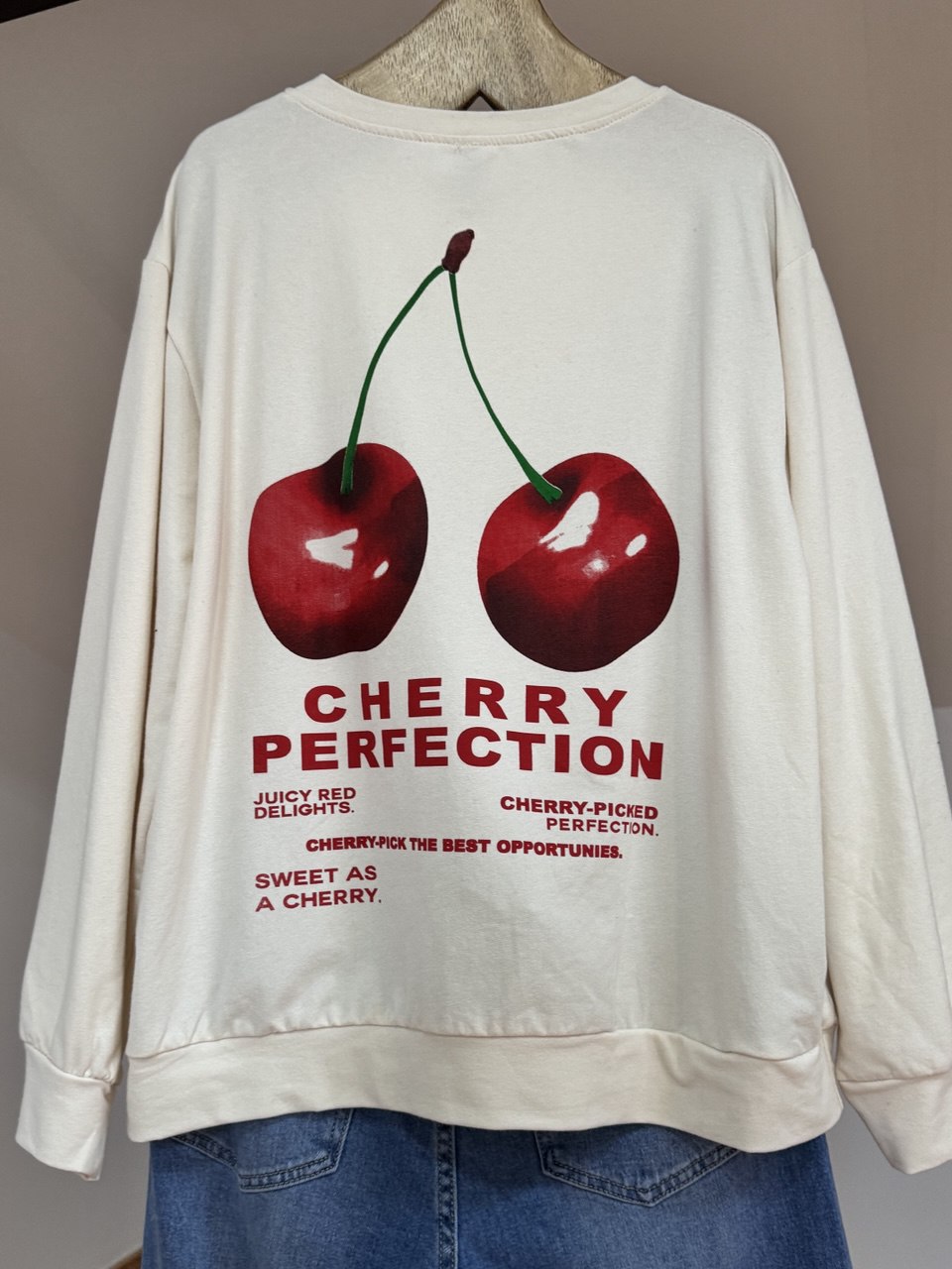 Sudadera color crema con estampado de cerezas 🍒, perfecta para un look casual y moderno. Su corte holgado y tejido suave la hacen muy cómoda y favorecedora. Talla única válida desde la S hasta la XL, ideal para cualquier tipo de cuerpo. Una sudadera oversize de mujer perfecta para combinar con vaqueros o pantalones anchos.